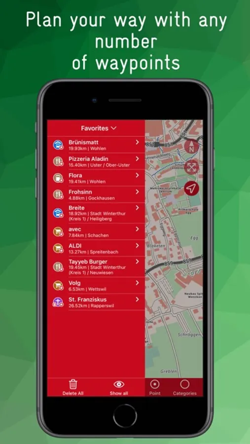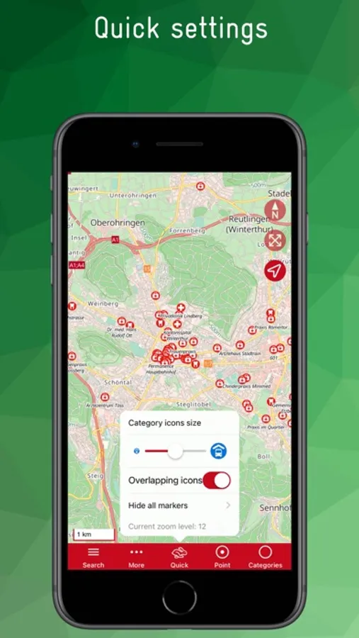 POIs are grouped into categories and can be displayed as layers. For example, you can display all restaurants, public transport lines, banks, hiking trails, charging stations and doctors on the map. The size and overlap of the icons can be adjusted to improve clarity.