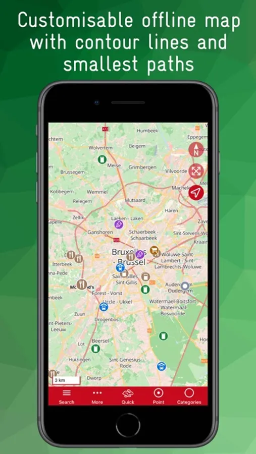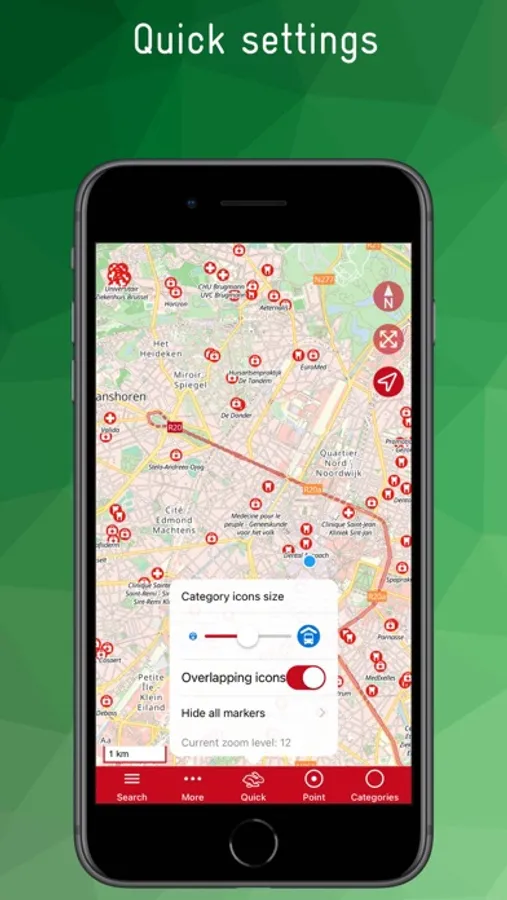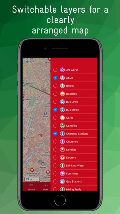 POIs are grouped into categories and can be displayed as layers. For example, you can display all restaurants, public transport lines, banks, hiking trails, charging stations and doctors on the map. The size and overlap of the icons can be adjusted to improve clarity.