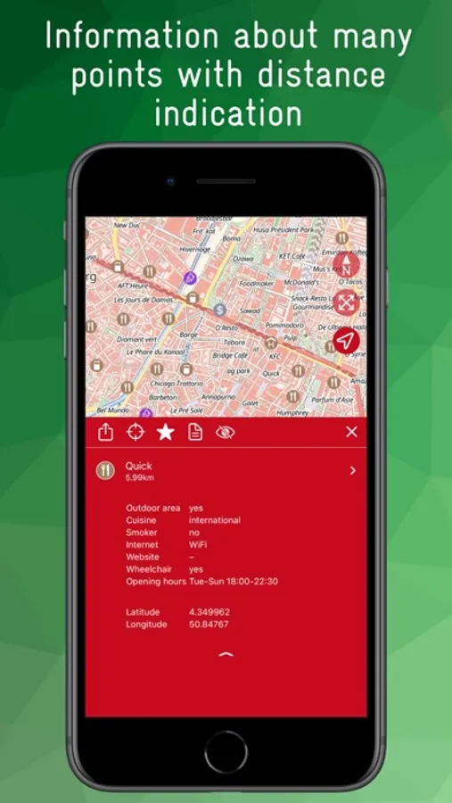 For many POIs there is further information such as opening hours, address, disabled access, ... Notes or favourites can be created for each POI, a history list shows the most recently used POIs, content can be shared.