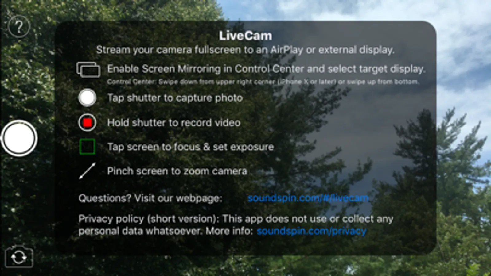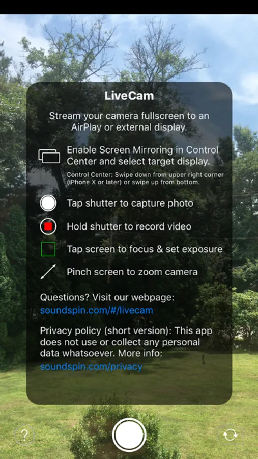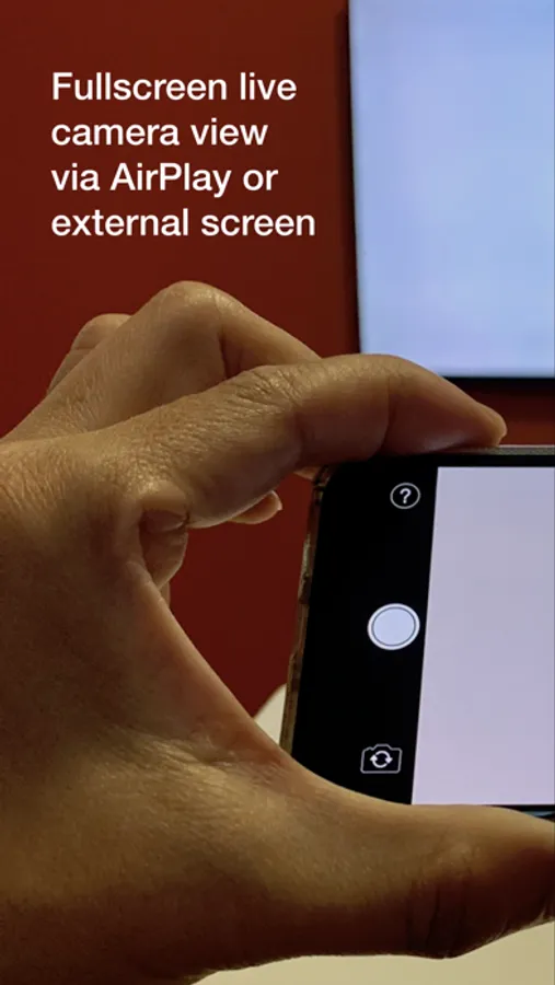 LiveCam is built for a single purpose: to stream your iPhone camera fullscreen to an AirPlay® or wired external display without any distracting elements. Your audience sees only what you want them to see, a fullscreen camera view, without any additional controls or interface elements.