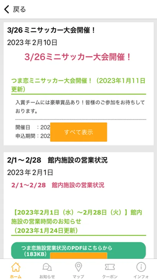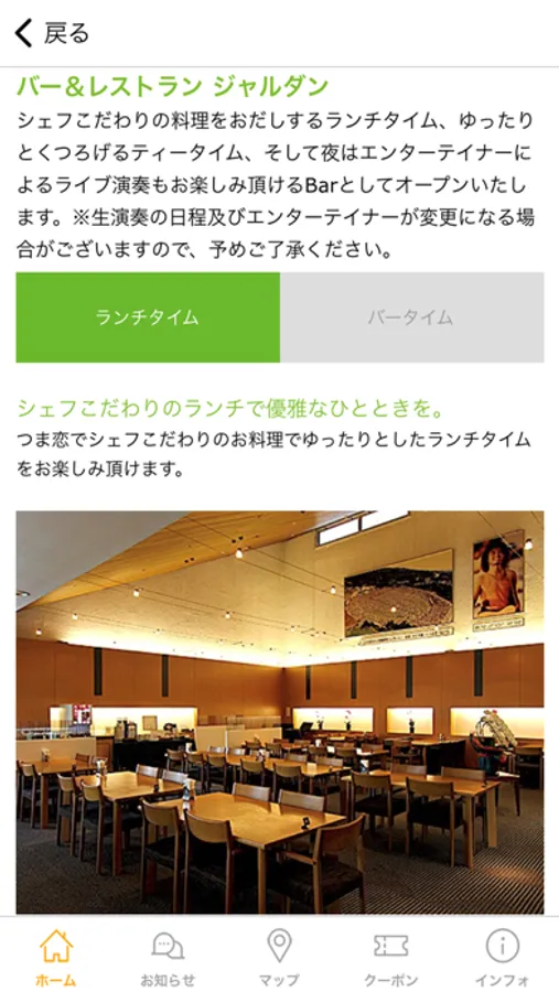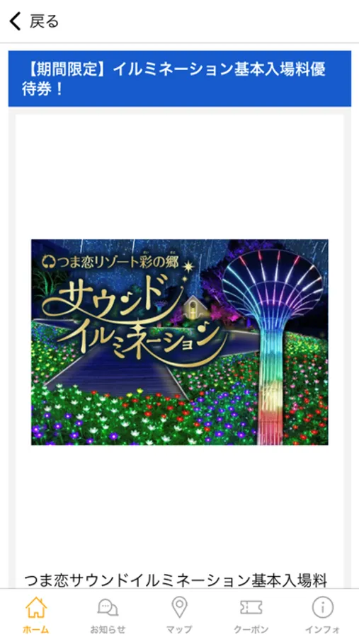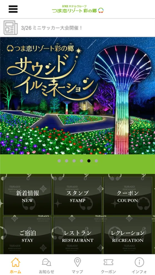 ※メニュー内容は随時更新・変更致します。た泊まる・食べる・癒す・遊ぶ・リゾート施設「つま恋リゾート 彩の郷」の公式アプリです。「つま恋リゾート 彩の郷」公式アプリでは、当リゾートのイベントなど最新情報をはじめ、レストラン『ジャルダン』ご利用やレクレーションセンター利用でたまるスタンプカード、季節に合わせたアプリ会員様限定のお得な優待クーポンをご用意しております。《アプリ会員様限定特典》①スタンプつま恋リゾートのレクレーションセンターのスポーツとレストラン『ジャルダン』お食事のご利用で、1日1スタンプをプレゼント!7個集まるとレクレーションセンターのスポーツを1種目サービスいたします。(他券併用不可。大会等の特別営業日にはご利用いただけません)②クーポン季節に合わせた会員様限定の優待クーポンをプレゼント致します。(他特典割引券や他サービスとの併用不可)《アプリメニュー》・新着情報つま恋リゾートからの最新のイベントや各種情報をお知らせいたします。・スタンプつま恋リゾートのレクレーションセンターのスポーツとレストラン『ジャルダン』お食事のご利用で、1日1スタンプをプレゼント!7個集まるとレクレーションセンターのスポーツを1種目サービスいたします。・クーポン季節に合わせた会員様限定の優待クーポンをプレゼント致します。(他特典割引券や他サービスとの併用不可)・ご宿泊「ホテル ノースウイング」「ホテル サウスウイング」の施設情報や宿泊プランのご紹介・ご予約ができます。・レストランつま恋リゾート 彩の郷自慢の「ビュッフェテラス」「バー&レストラン ジャルダン」のメニュー紹介や、ステージ情報などをお届けいたします。・レクリエーション自然、スポーツ、音楽が一体となった総合リゾート施設ならではの様々なレクリエーションをご紹介しています。・森林の湯大自然に囲まれた「森林の湯」やエステ「素肌美庵」、ボディケア「手もみ処」の営業インフォメーションをお届けしています。・ブライダル1日1組限定の「つま恋の結婚式」に関する情報です。ウェディングプランはもちろん、ブライダルフェアなどの各種最新情報も御覧いただけます。※メニュー内容は随時更新・変更致します。