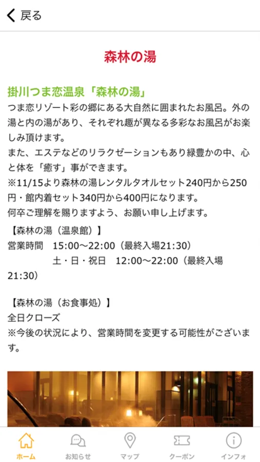 大自然に囲まれた「森林の湯」やエステ「素肌美庵」の営業インフォメーションをお届けしています。