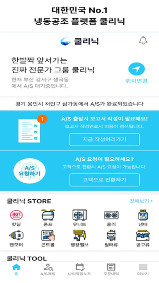 지역내 쿨리닉 플레이스가 있다면 현장에 필요한 부품을 1시간이내 조달 받을 수 있습니다.