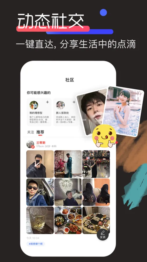 【动态】广场动态让您时刻关注心仪对象,也可随时分享您的动态,把精彩全面展示出来。于千万人之中,说不定就有缘分因此邂逅。