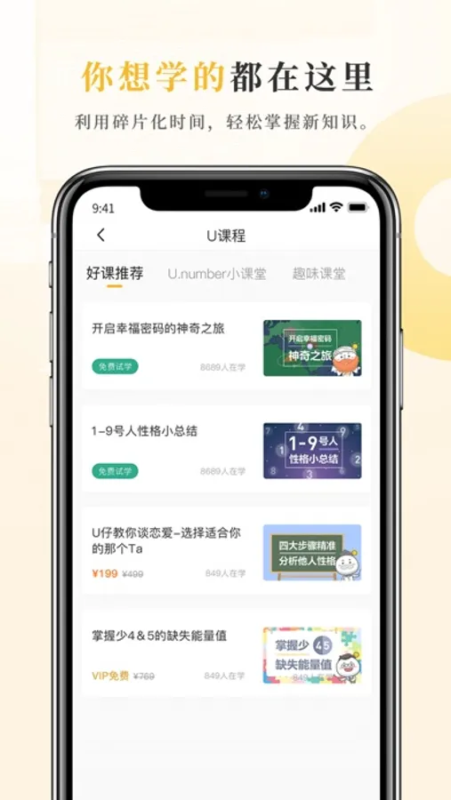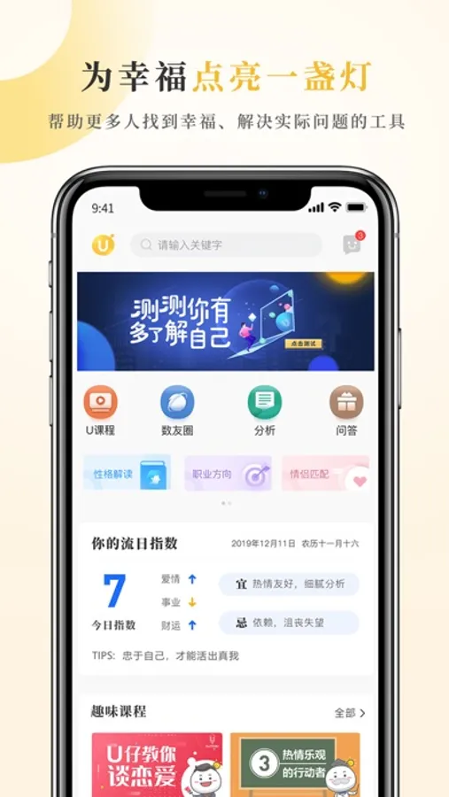 测试版块结合了【U.number小课堂】的课程内容,将大家日常所关心的运势运程、事业发展、两性关系、亲子教育、家庭关系、人际交往等方面,根据每个人不同的七魄数字总结成实用性强、详细易懂的分析报告,为大家提供最实用、最直接的落地工具。