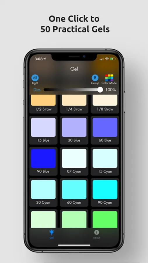 - Gel mode also need light devices with RGB function. It provides 40+ different gel color.