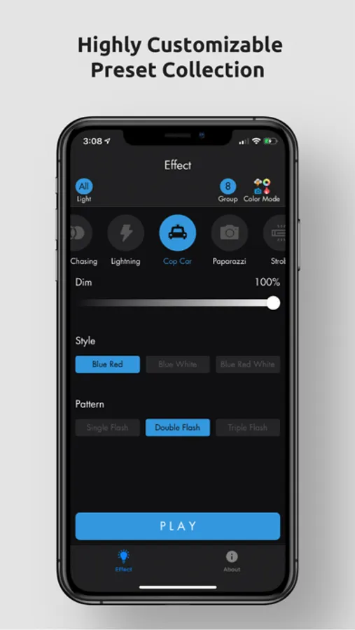 - Effect mode allows user customize their effect. It provides total 10 different effects, 3 of them are RGB effects and 7 of them are white color with different CCT effects.