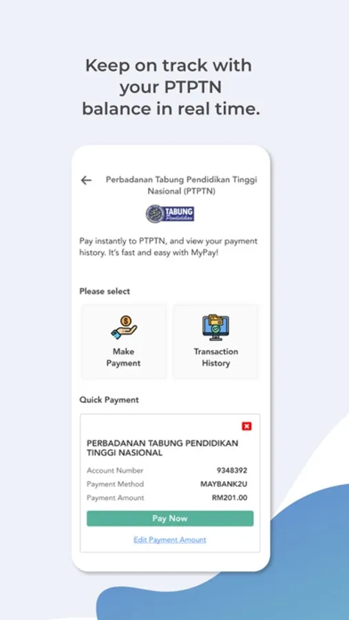 Seamlessly make payments to government agencies, including Zakat contributions, with just one click. Never miss a beat with our MyPay Coin Conversion booth locator, allowing you to easily convert your coins into cash. Plus, keep track of your PTPTN account balance and make payments with ease.