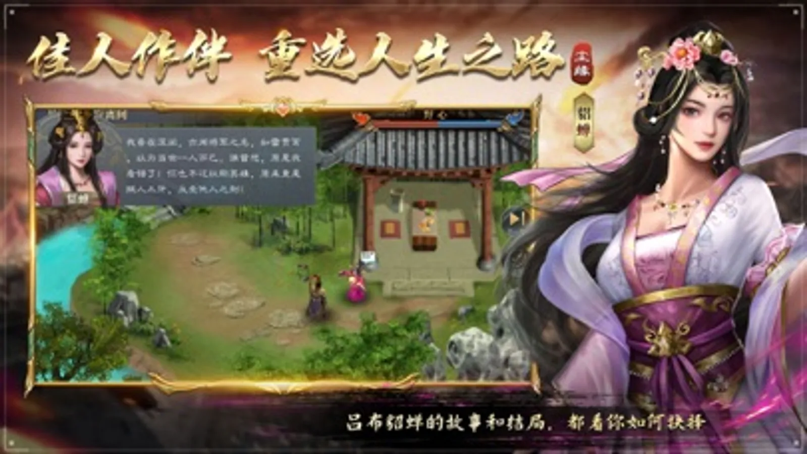 玩家将扮演吕布在关键历史事件中做出决策,左右着吕布的性格与命运,吕布是像历史上一样继续重蹈覆辙,还是迎来未知的新结局,皆在玩家的选择之中。不同故事线中,加入和吕布一起成长的武将也不同,甚至可以收服其他阵营的武将。
