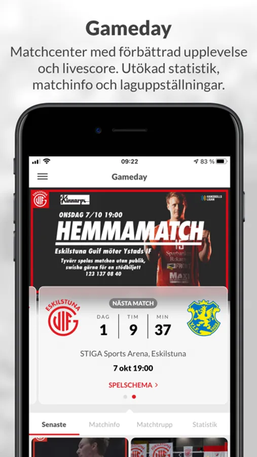 Gameday är Eskilstuna GUIFs officiella app och digitala matchprogram. Här hittar du senaste nyheterna, intervjuer, statistik, tabell, spelschema och aktuella trupper. Du kan även följa matcherna via livescore och se highlights från Handbollsligan.