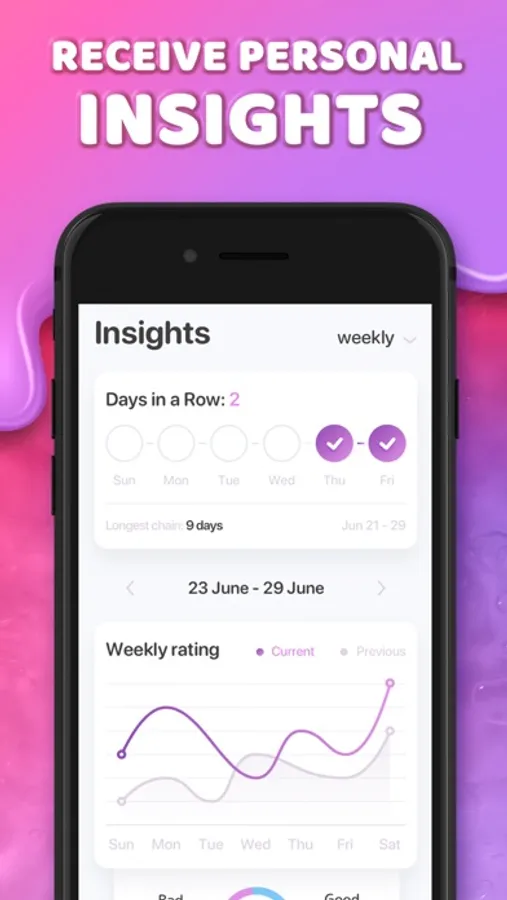 To activate your mood tracker, start by simply selecting how you're feeling, ranging from any emotion that matches you. Next, define the reason for this mood and save it, detailing the date and time. Now, the tracking begins. This mood tracker instantly keeps a record and starts building your personalized relief journal to provide an accurate breakdown of your mental health. You can explore weekly mood ratings, discover how often your moods change, follow your top moods, and identify the activities that cause emotional shifts.