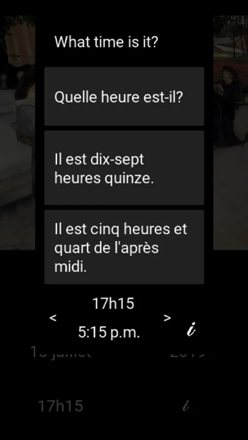 Select the current time, day, date, and year to see translations in sentence form, along with audio. Includes pictures of famous French artwork, architecture, and travel destinations. See descriptions of each picture in English and French, with audio. Learn to pronounce these famous places and works of art in French. At date/time themed sentence is shown each day to further expand your knowledge. Learn different ways to ask the weekday, date, time, and year. Practice saying the current date and time throughout the day. All numbers corresponding to date and time are spelled out, and audio can be played for pronunciation. Become familiar with the official and informal ways of telling time in French. Beginner to medium skill. This app contains no ads or in-app purchases.