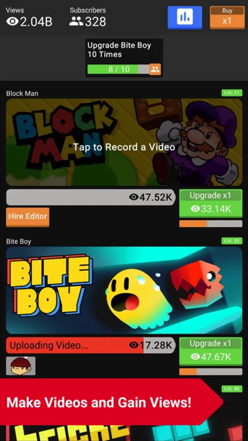 Grow your channel, hire editors, and gain millions and millions of views! Compete with the top Tubers on the leaderboard.
