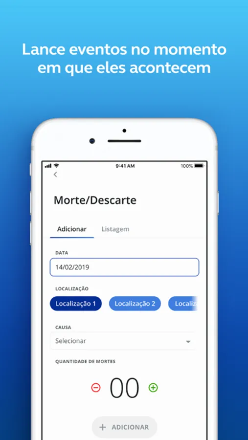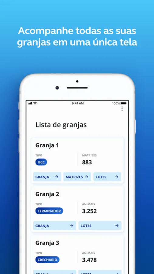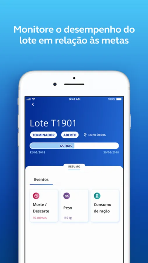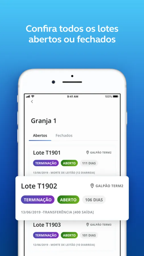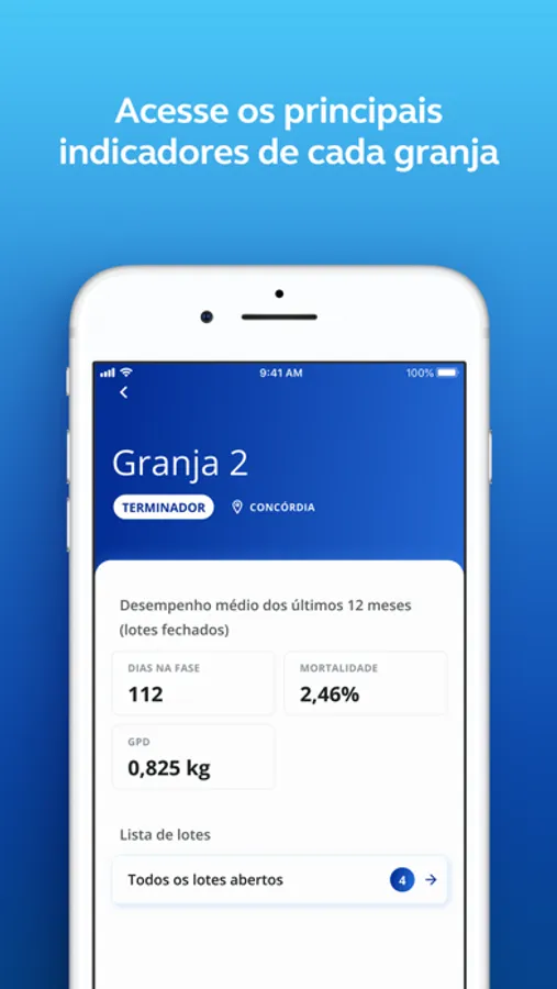 O app possibilita a coleta de dados ligados a lotes de creche e terminação, além de apresentar um perfil com dados de desempenho do lote.