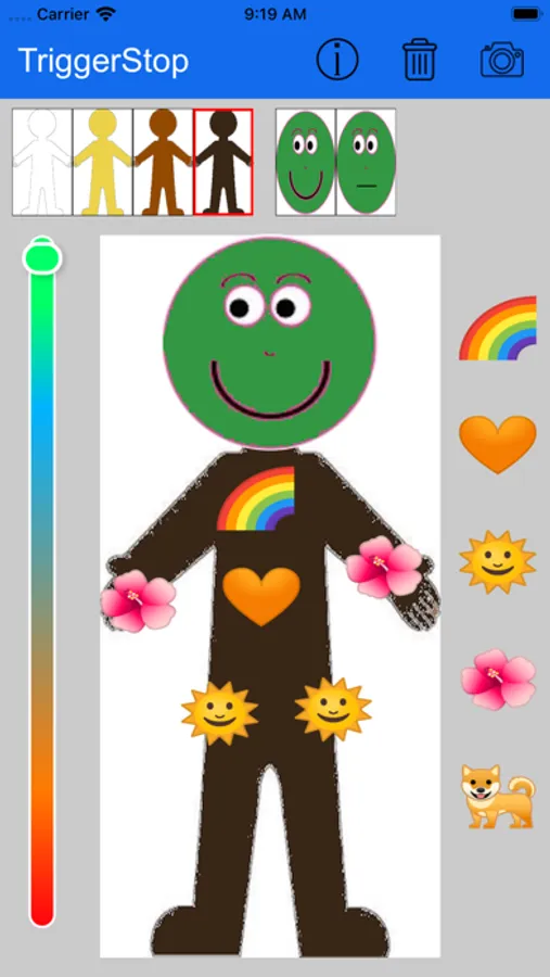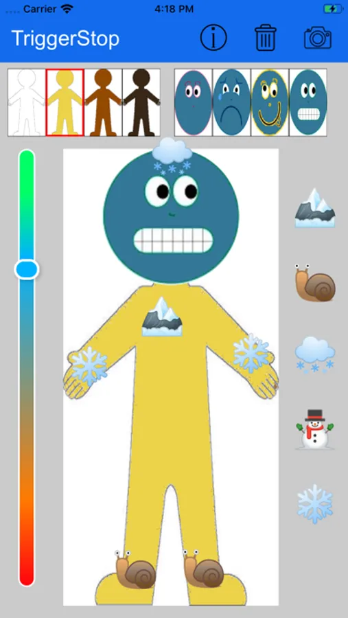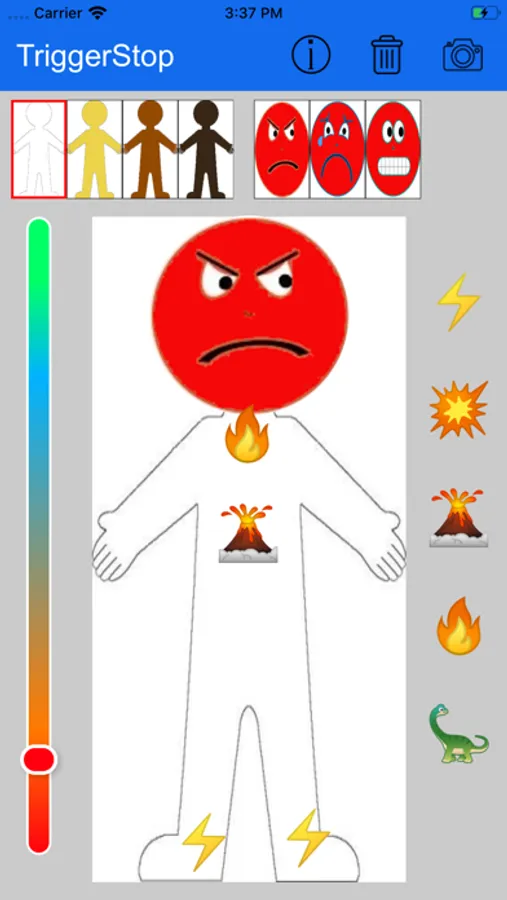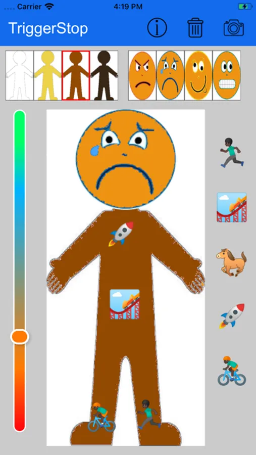 Self-regulation and the ability to identify and communicate sensations and emotions may be difficult for a child when they are in fight, flight and freeze. With a trauma trigger it is common to lose the ability to communicate with words. Pointing or dragging sensory and feeling images to the body allow children another way to communicate to an adult how they feel without the use of words. This APP helps children identify and communicate sensations and emotions.