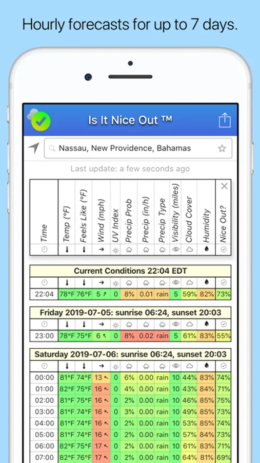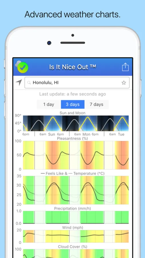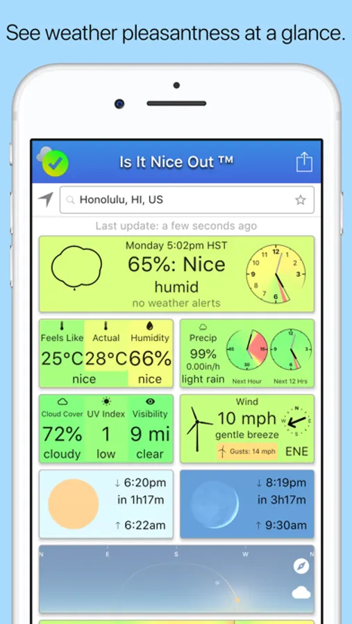 When will the weather be nice? Is It Nice Out provides high accuracy weather forecasts, and summarizes them into a single pleasantness score.
