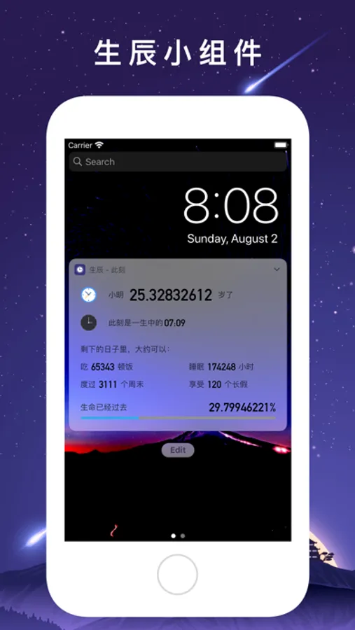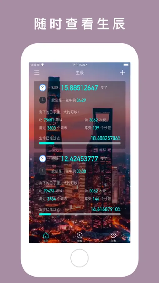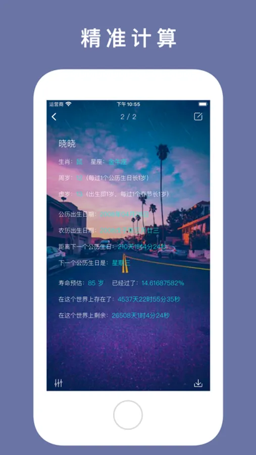 生辰 - 年龄计算器珍惜时间,能够一键告诉您您在这个世界上存在了多少天,能预估您剩余多少天,能够精准的计算出您的星座生肖,周岁和虚岁,提醒您珍惜时间。同时还支持动态背景和静态背景设置,还可以修改背景透明度和模糊度。
