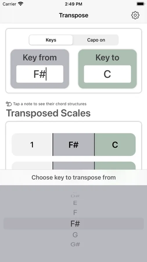 Transposer strive to make it as easy as possible to transpose from one key to another displaying both keys scale and their numeric value.