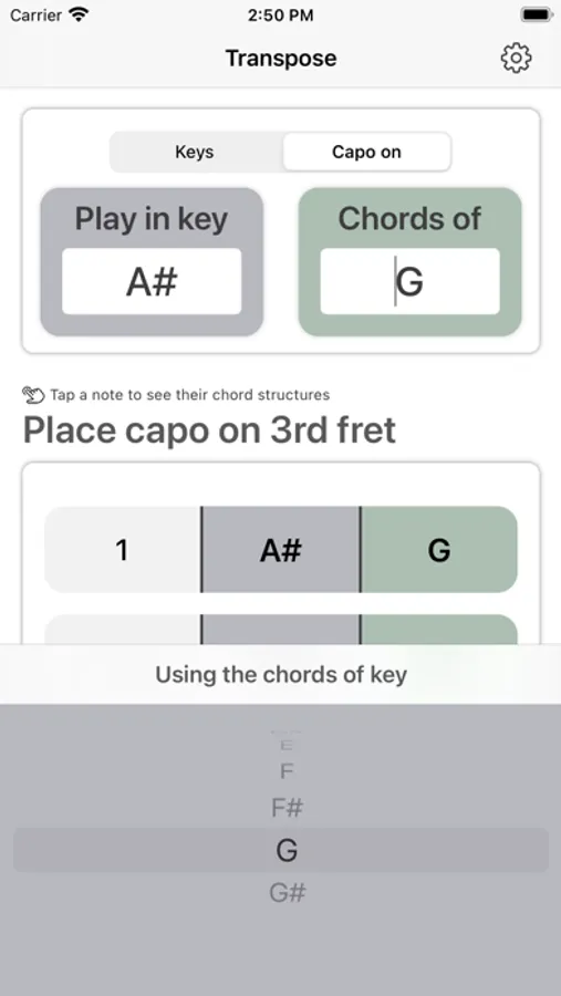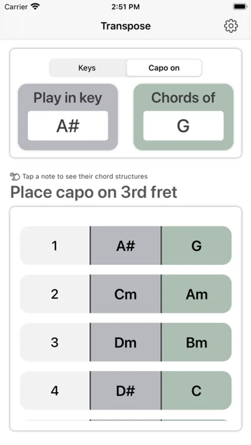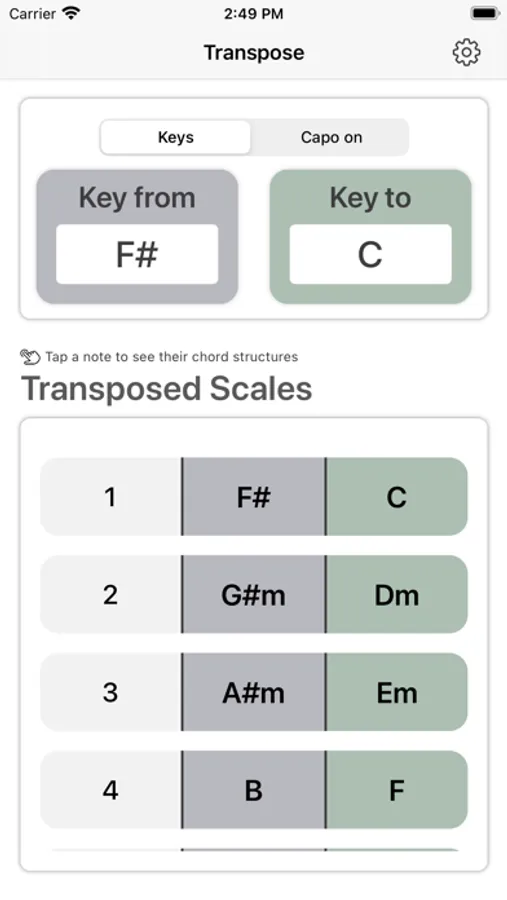 With Capo On you can choose the hardest key ever and the key you are most comfortable with and Transposer will display the fret number on which your capo should be.