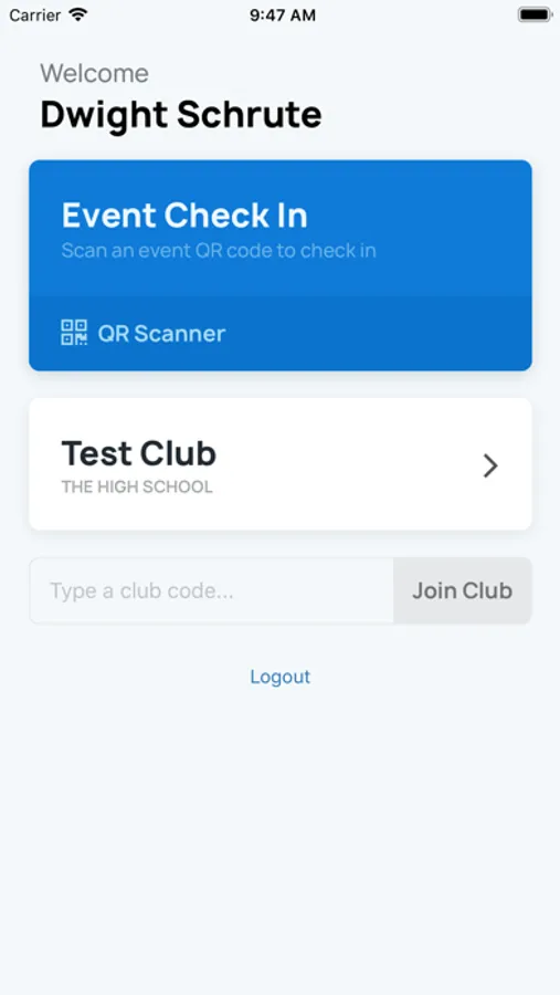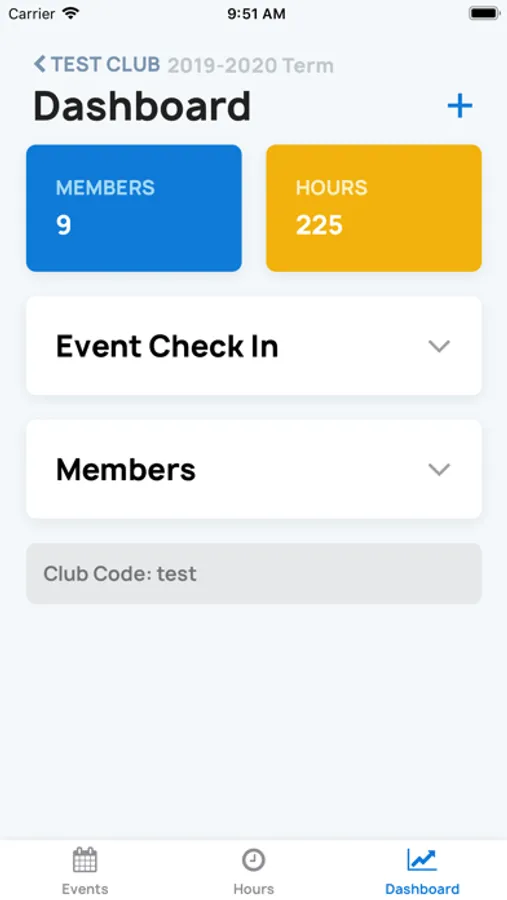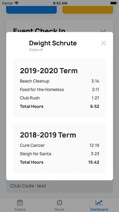 Members can conveniently stay up to date with upcoming events and their past volunteer hours from each year while club officers have additional access to the club dashboard. The dashboard gives officers quick access to club statistics, event QR codes, and member hours. Officers can add events or hours for members who didn't scan to check-in by clicking on the "+" button.