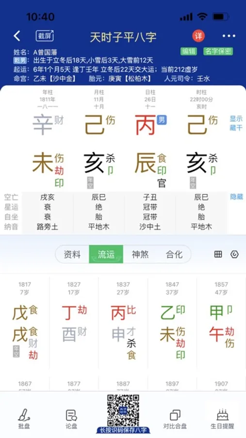13、独创支持大运前详细批盘功能:可以详批每一大运及流年,永久云端免费保存;可将多人测算的八字记录保存在同一八字下,便于对比复盘.