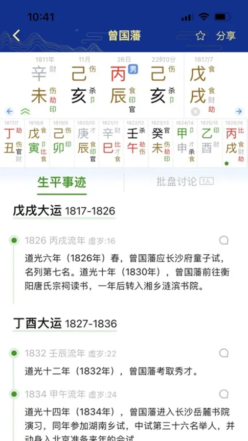14、命盘与在线论盘联动模式:可打通与微信等社交平台进行讨论,并将讨论记录永久保存至相应八字下面,便于复盘学习,支持点击聊天记录中的年份自动跳转八字流年。