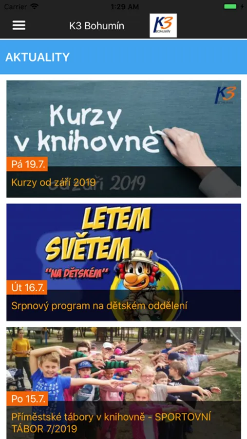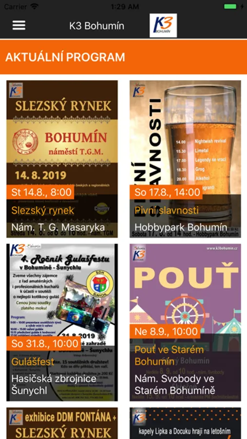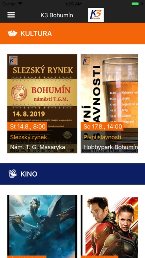 Mobilní aplikace K3 Bohumín je skvělým pomocníkem pro snadnou a rychlou orientaci nabídky kulturních a společenských akcí v K3. Najdete v ní kompletní kulturní seznam, aktuální program kina, který je také členěn do kategorie "děti" a "senioři". Dále se dovíte jaké jsou horké novinky z knihovny a co je na jejím programu. Mobilní aplikace K3 je skvělým pomocníkem nejen pro občany Bohumína.