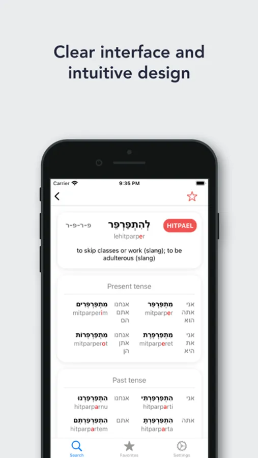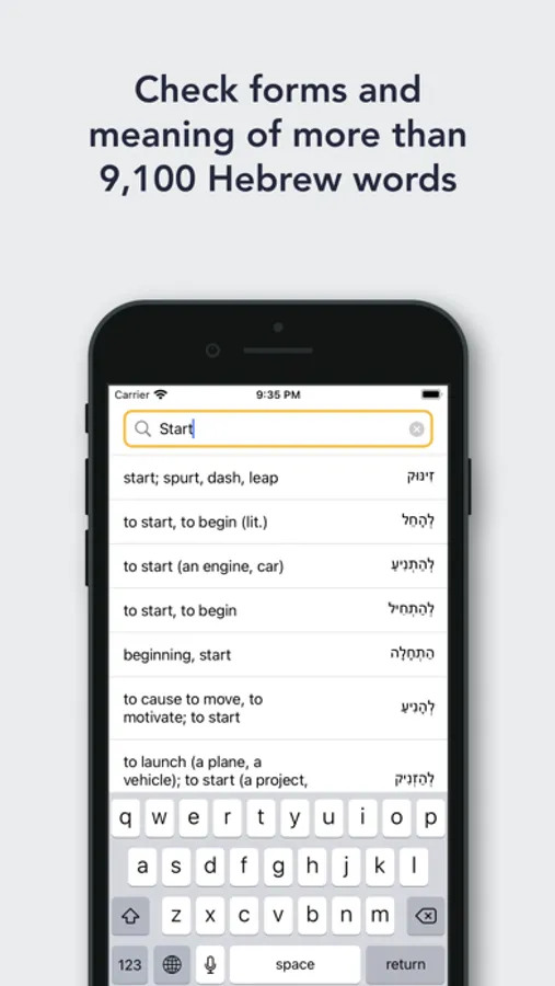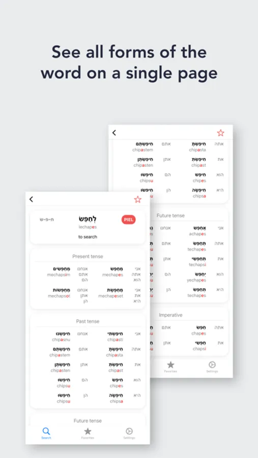 Check all forms of 9,100+ Hebrew words in a fast and straightforward mobile tool: verb conjugation tables and forms of nouns, adjectives, numerals, prepositions, etc. Ad-free.