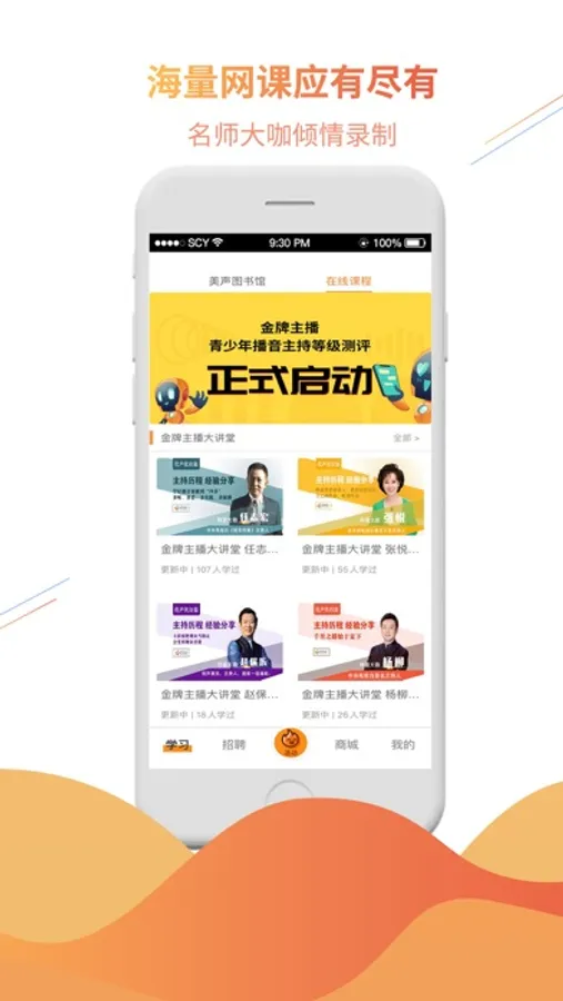 我们与业内专业老师、大咖合作,汇集了普通话学习、艺考辅导、播音主持专业、口才训练、新闻播音、节目主持、配音解说、朗诵艺术等9大类精品课程,是线下语言艺术培训的良好补充,助你在语言艺术学习过程中的阶梯式成长。