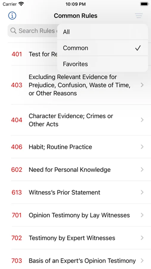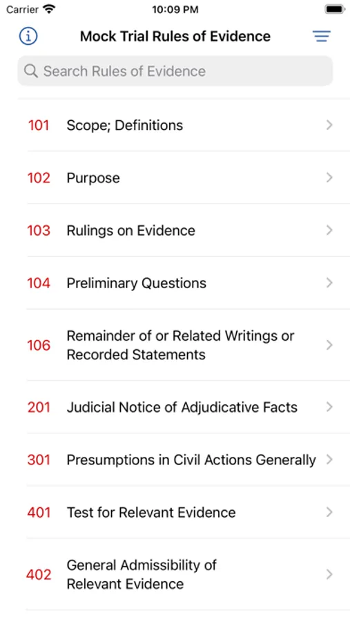 Mock Trial Rules of Evidence is an adapted version of the federal rules of evidence to correspond closely with the competition rule set for college mock trial. The rules are displayed in an easy to navigate user interface with a filter for most common rules and a search bar for easy inquires.