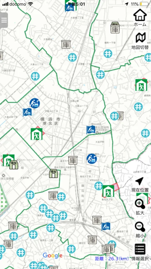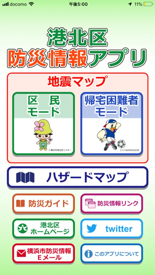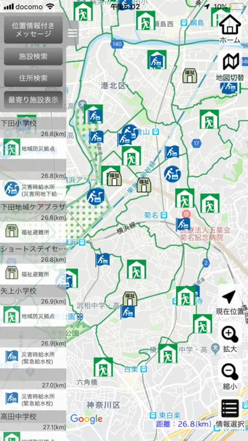 ・横浜市港北区民、帰宅困難者、ハザードマップの3つの地図表示モードを選択できます。
