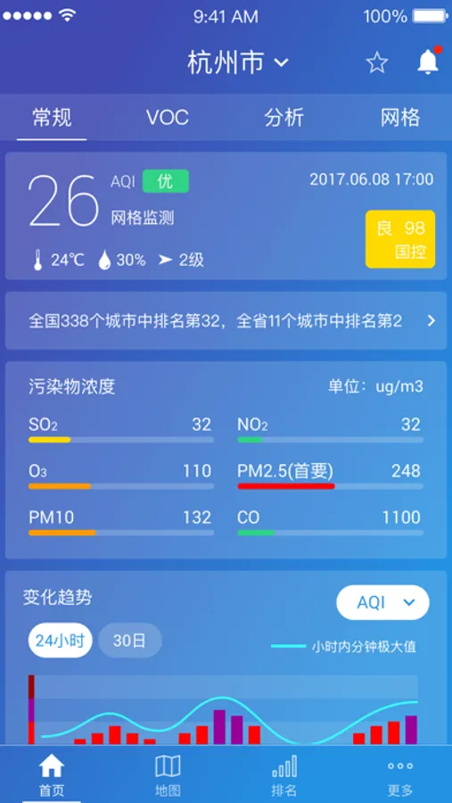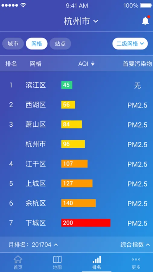 实时接入杭州市所有的乡镇街道空气质量监测情况,让市民一目了然的看到所在生活区域的空气质量,可以更好为锻炼、出行做好健康防护。愿我们的天空越来越蓝,空气质量越来越好。