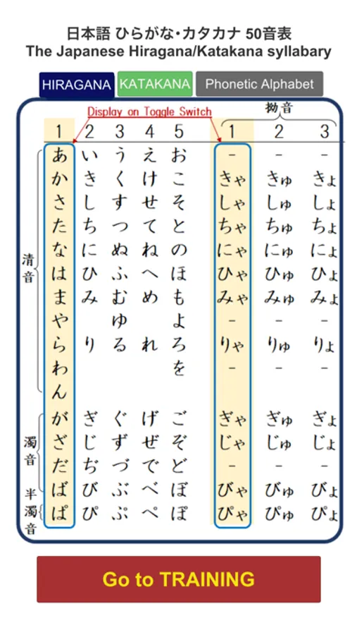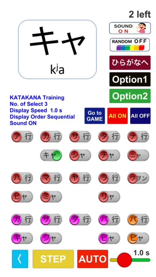 Option 1で間違えやすい形の「ひらがな・カタカナ」の練習