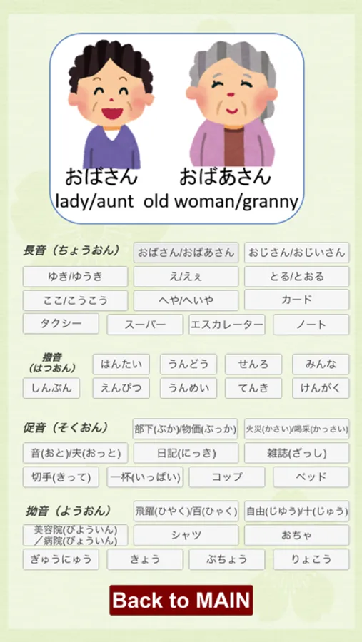 Option 2で日本語特有の発音である「長音・撥音・促音・拗音」のサンプルがあります。