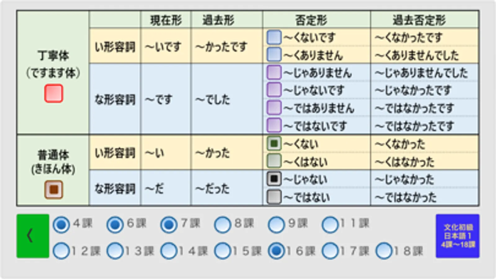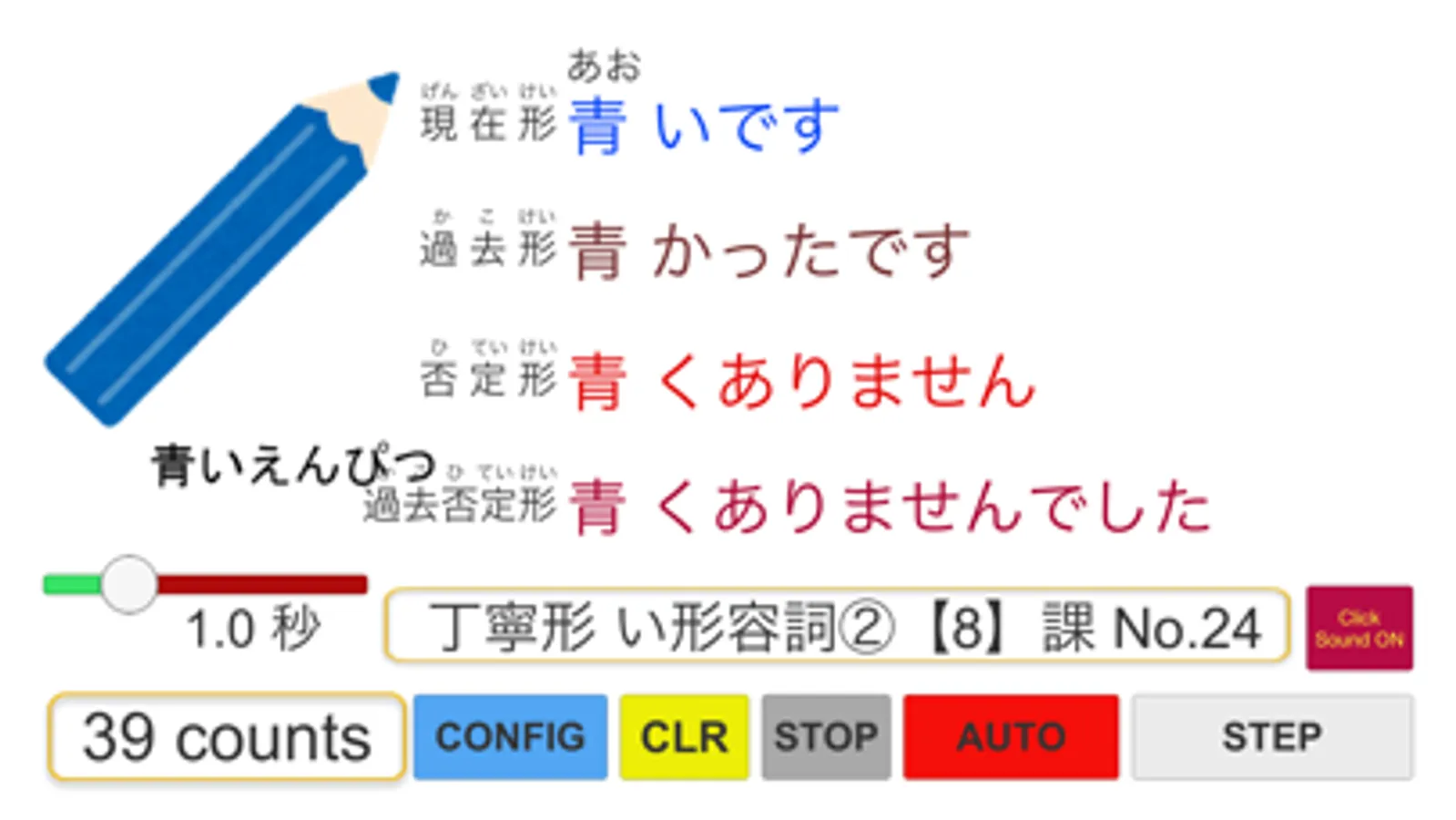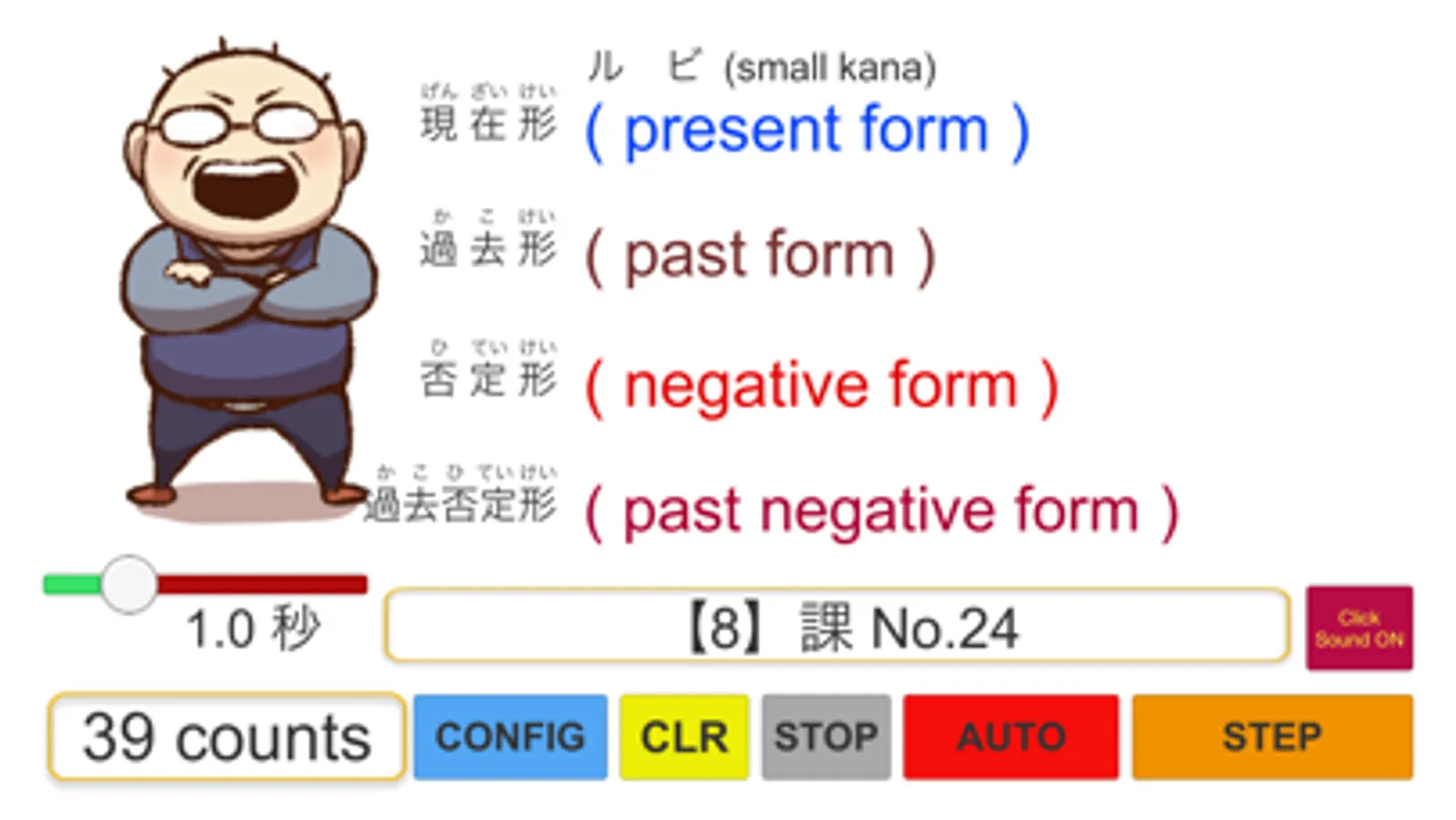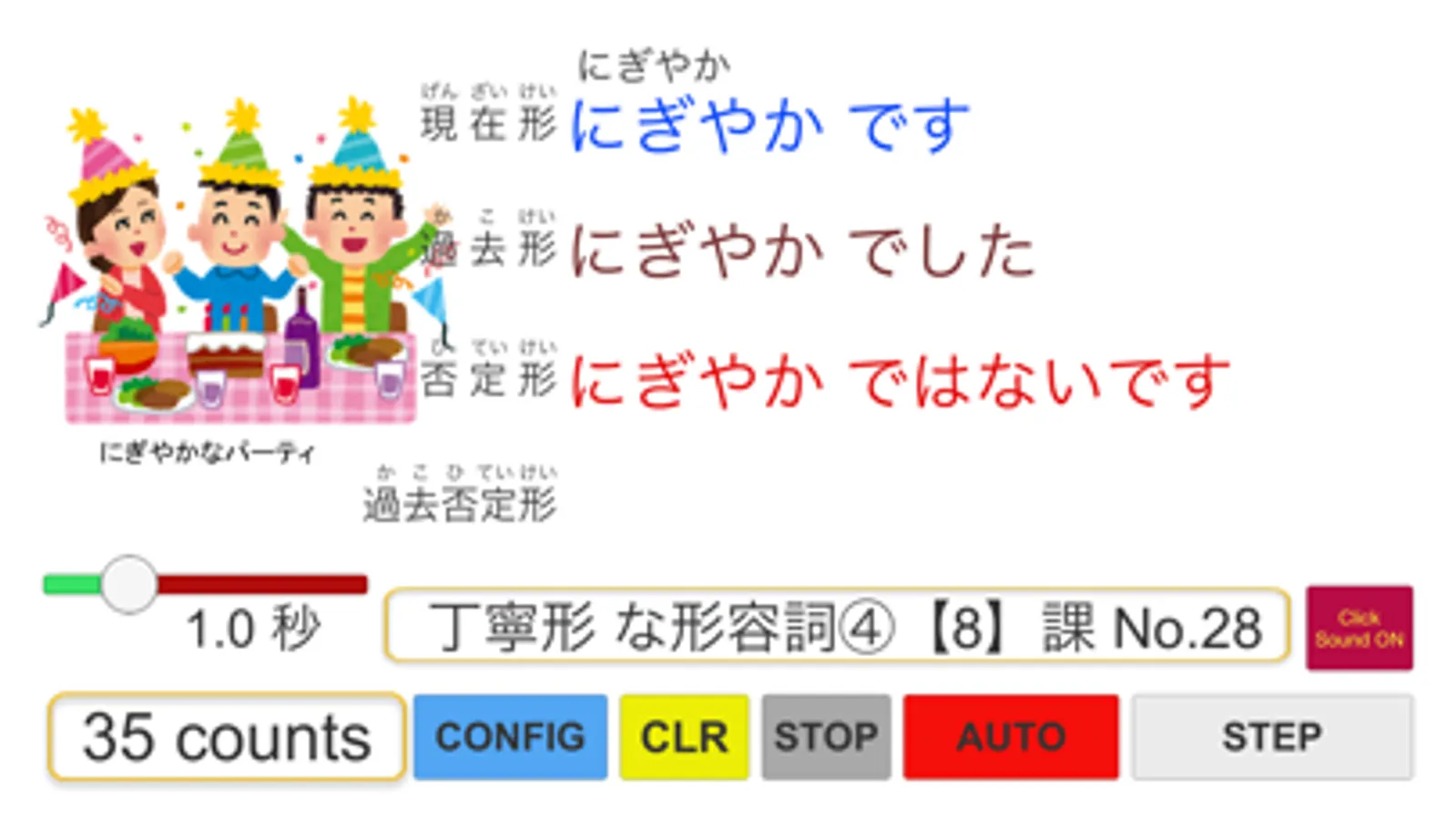 日本語の形容詞活用(現在・過去・否定・過去否定)がイラスト付きフラッシュカード形式で練習ができます。 ステップ機能が付きました。