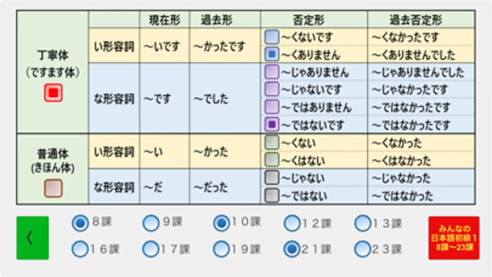 丁寧体(ですます体)か普通体(基本体)、そして(い形容詞)(な形容詞)の語尾を選んで練習することができます。