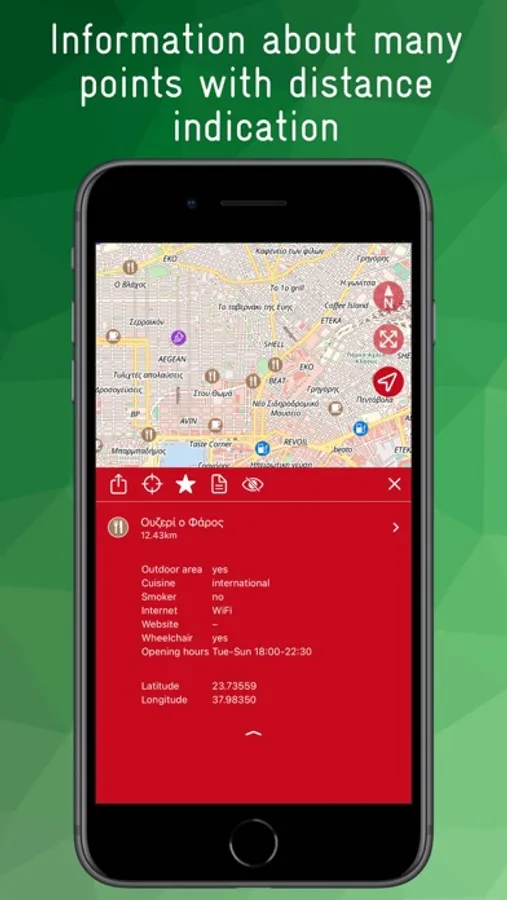 For many POIs there is further information such as opening hours, address, disabled access, ... Notes or favourites can be created for each POI, a history list shows the most recently used POIs, content can be shared.