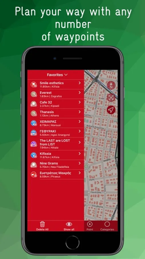 An integrated database allows you to search for POIs as well as a large number of streets, towns, villages, districts, etc. The search can be filtered by category and/or distance.