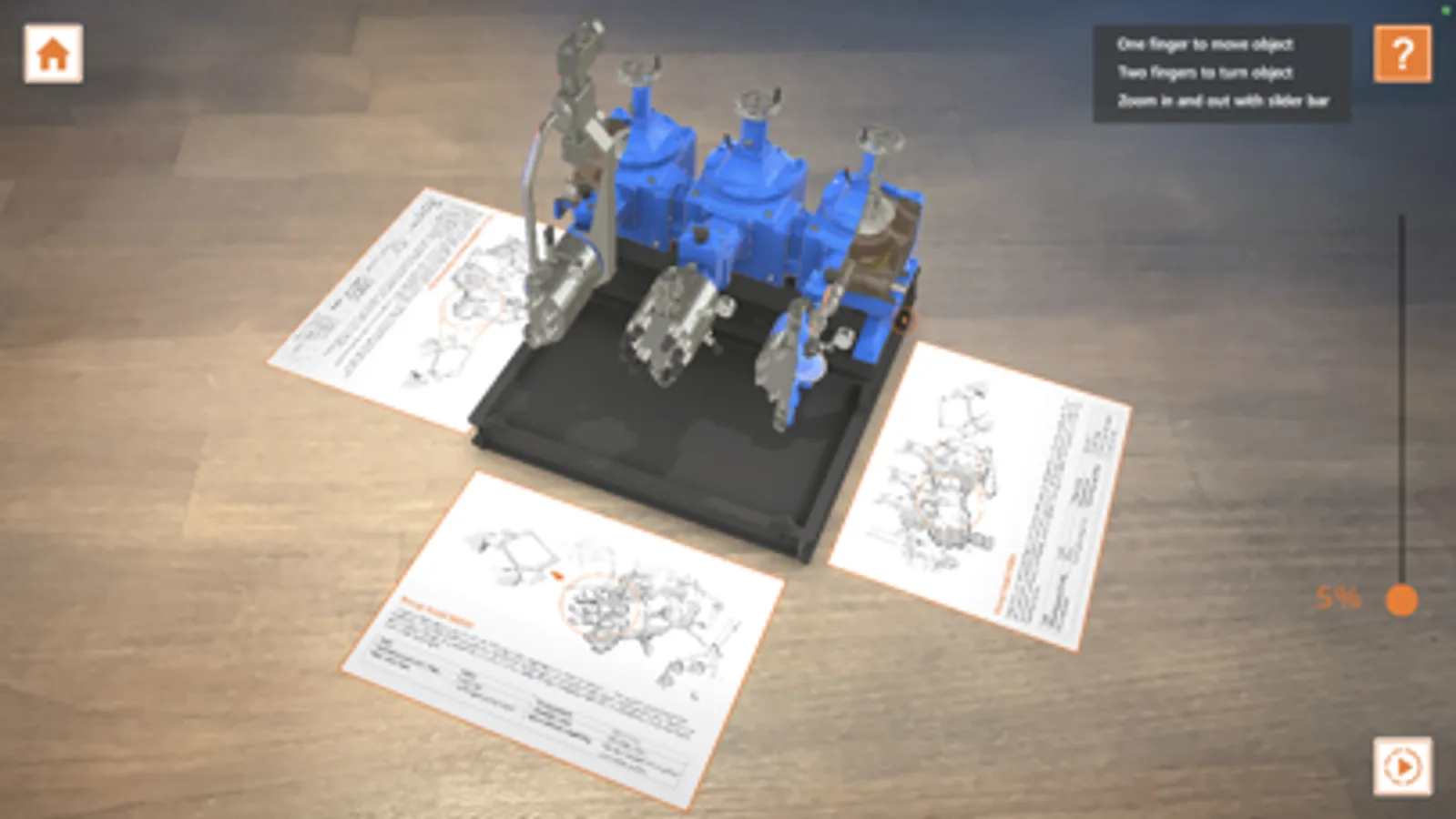 The application uses ground plane detection, which augments the pump onto every surface that has structure - like a floor or a wooden table.