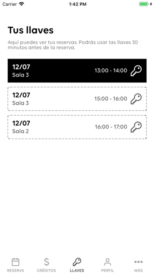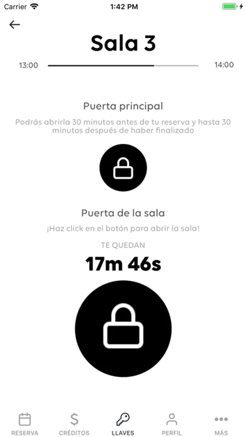 4. Accede a tu sala de entrenamiento a la hora reservada, pulsando el botón de apertura de sala del apartado de "Resrvas de la APP Bunker Coworkgym .