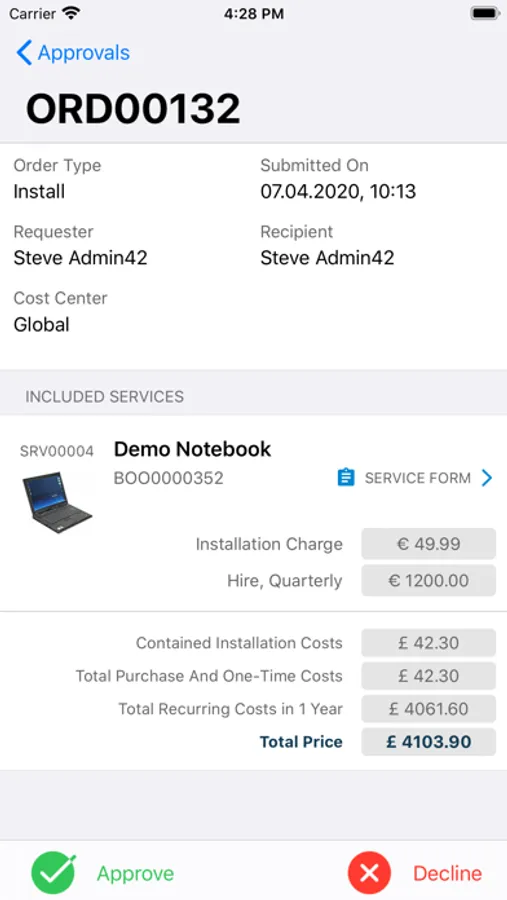 With the Matrix42 Approvals App deciders have an integrated solution to Matrix42 Service Management and Service Catalog. Open up the App, get pending Orders and decide. If you need more details, tap on an order check details or go further and have a look at the custom form. Need to decide a bundle of services? No problem, check details to see all the linked services of the ordered bundle!