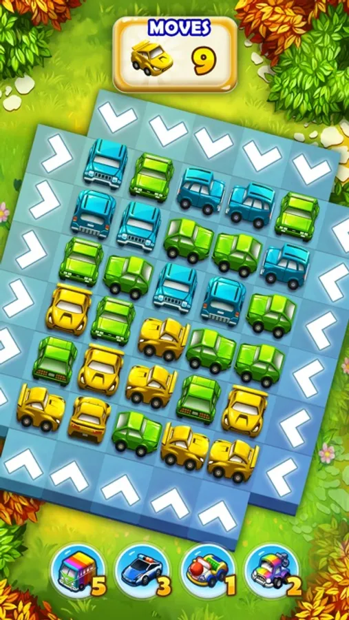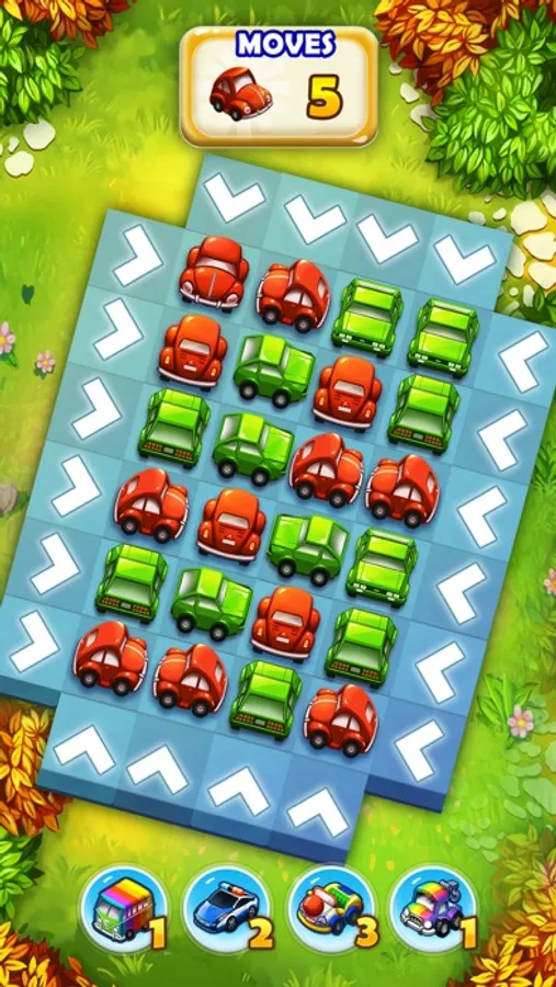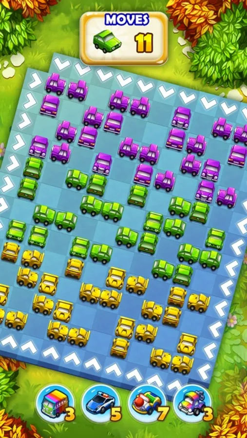 - Clear the roads by matching three cars of the same color