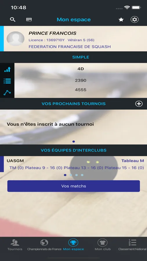 Vous pouvez accéder à vos compétitions, votre classement, vos équipes d'interclubs.