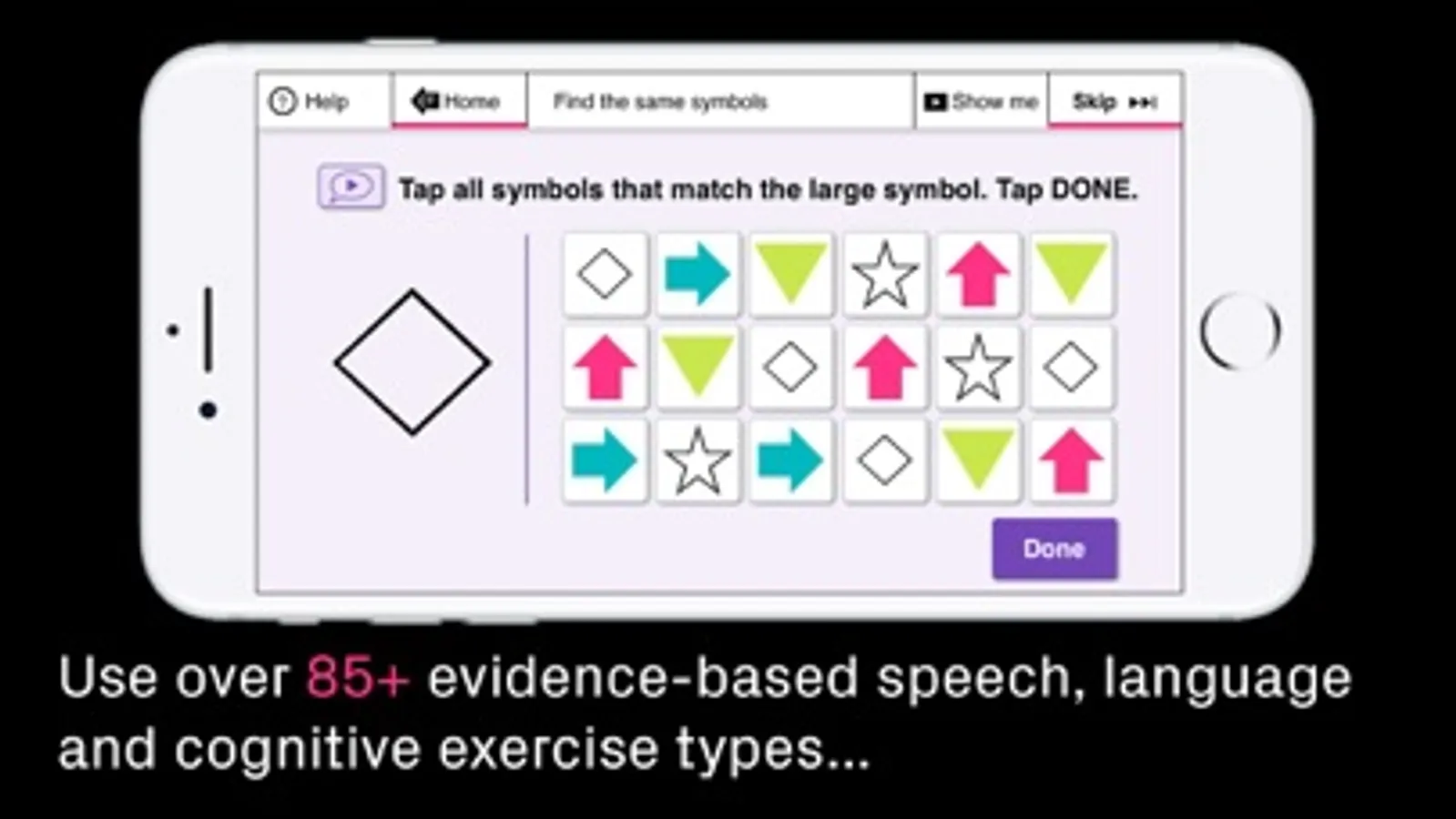 • Use 85+ evidence-based interactive therapy activities targeting speech, language, and cognitive skill areas, with 500,000+ individual exercises to keep your patients engaged.