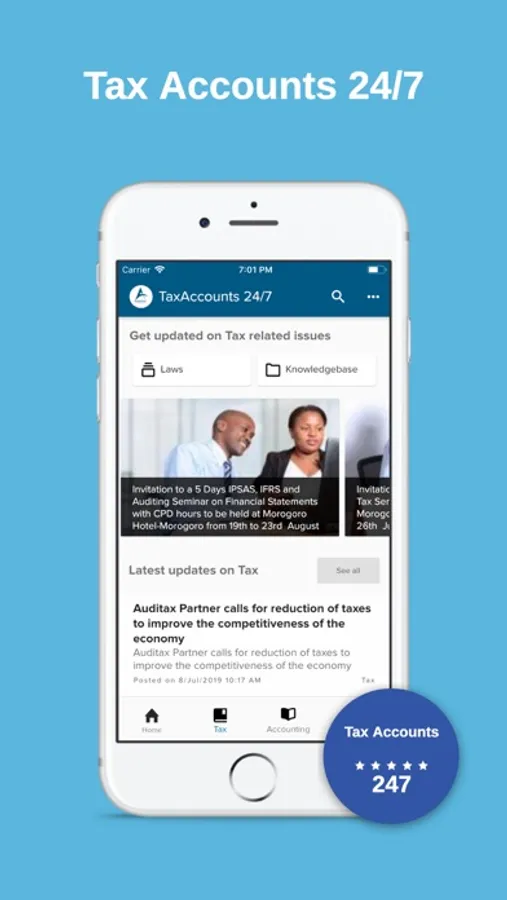 TaxAccounts 24/7 will update you on changes in tax laws in Tanzania, accounting and auditing changes both in Tanzania and globally. You will also get access to current tax laws and other important laws for accountants, auditors and tax practitioners and summarized provisions of pronouncements by professional bodies of Accountants, external and internal auditors. The App will also provide you with updates on relevant matters affecting businesses.