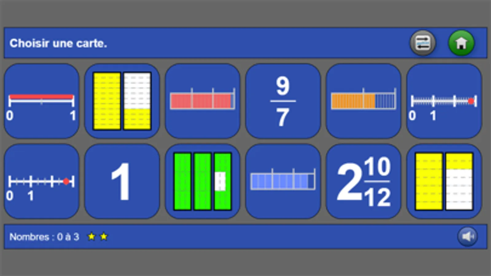 The FractionRepMatch game involves matching cards that show different part-whole representations of fractions. Select a range of values. Depending on the range selected, numbers may be proper fractions, improper fractions or mixed numbers. Select two or more types of representations: numbers, arrays, fraction strips or number lines. Match cards representing the same number. The game can be played face-up or face-down as a memory game.