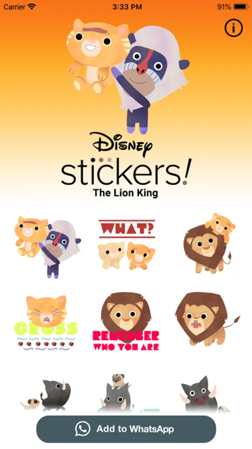 Celebrate the Circle of Life with 24 NEW animated stickers for iMessage and WhatsApp. Add the Pride Lands to your texts with Simba, Nala, Timon, Pumbaa and all your favorite characters. Pounce on your chance to download these stickers now, and see The Lion King in theatres July 19.