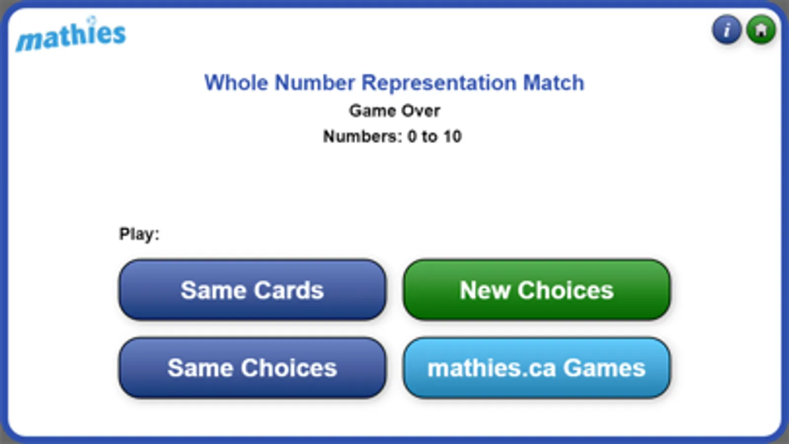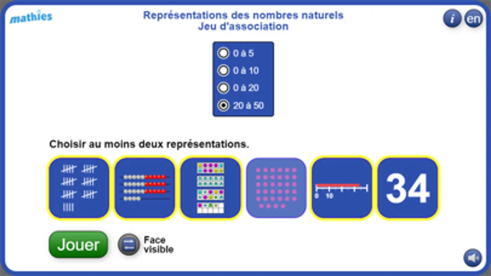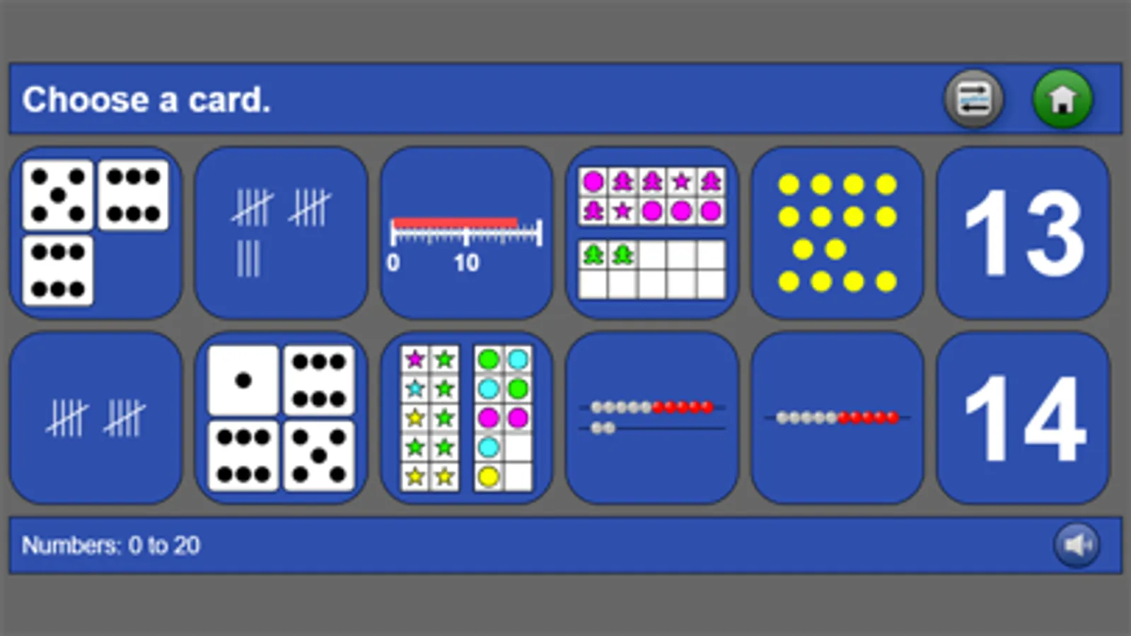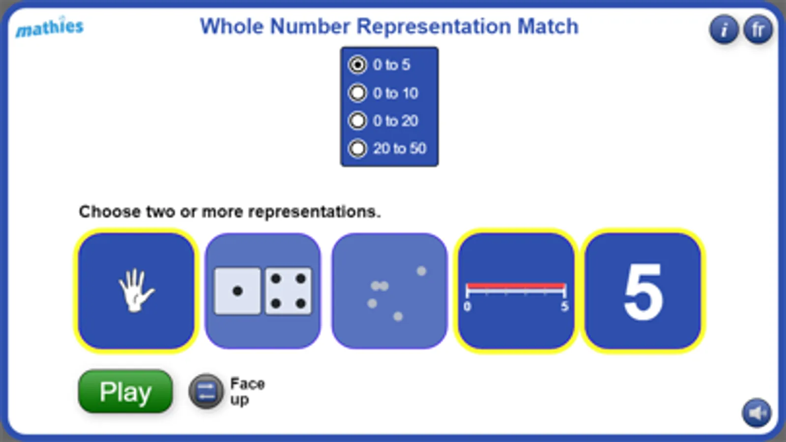 The WholeRepMatch game involves matching cards that show different representations of whole numbers. Select a range of values. Select two or more of the available representations: fingers, tallies, dice, rekenrek beads, ten frames, random dots, number lines or numerals. Not all representations are available for each range. Match cards representing the same whole number. The game can be played with cards face-up or face-down.