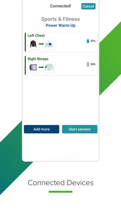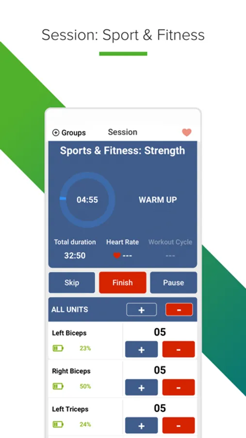 From pre-warm up, to Combined Muscle Training (CMT) and warm down, you can select full body NMES stimulation for warm up and cool down with the sports tech gear, to two functional muscle groups in CMT training or where required, isolated individual muscles for focused muscle stimulation and treatment.