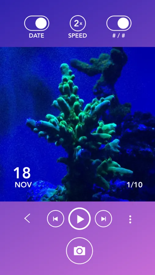Start by taking pictures of your corals, plants, snails, crabs, starfish, and full sections of your tank. Every few days take another picture using the same orientation. I've created an easy to use the overlay tool to line up your shot from the previous photo. Once you have enough photos, hit play and watch your plants and corals grow before your eyes! When it's time to post progress, with a touch of a button a time-lapse video will be created for you to save to your device library and to share on your favorite aquarium social media channels.